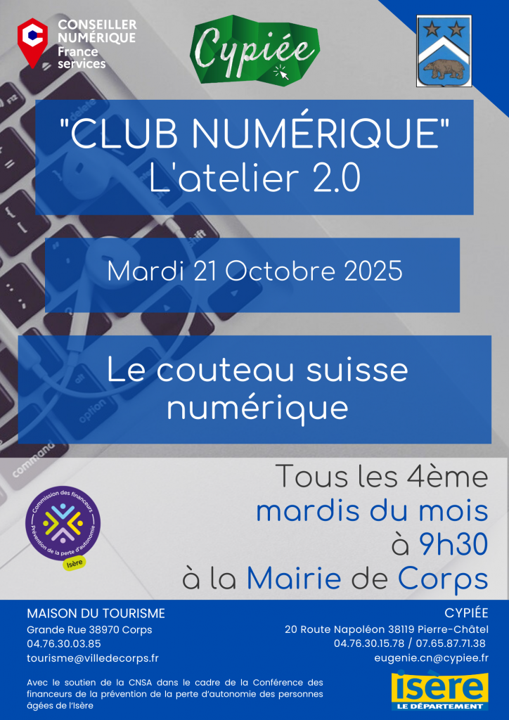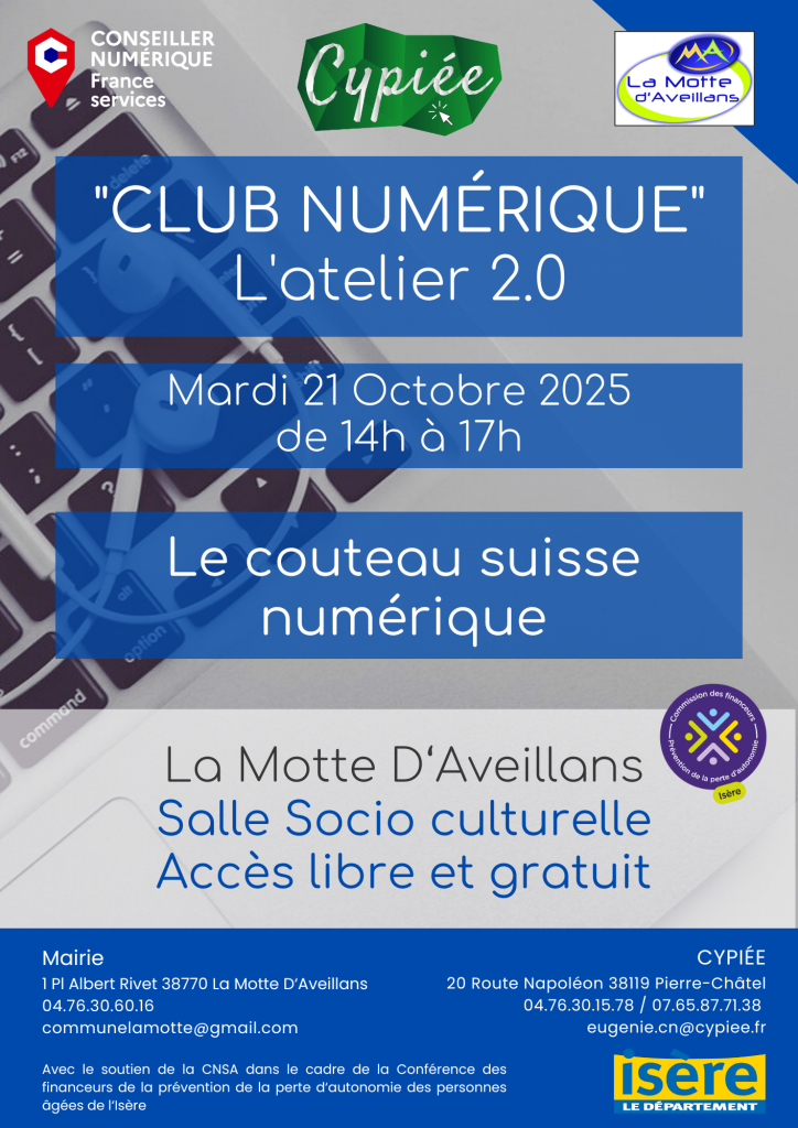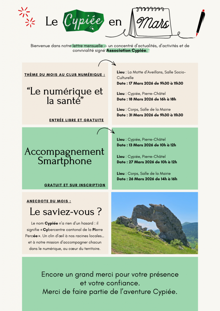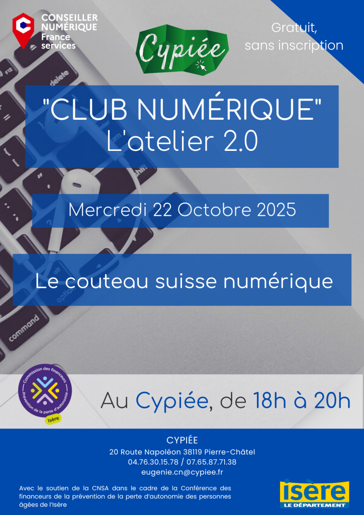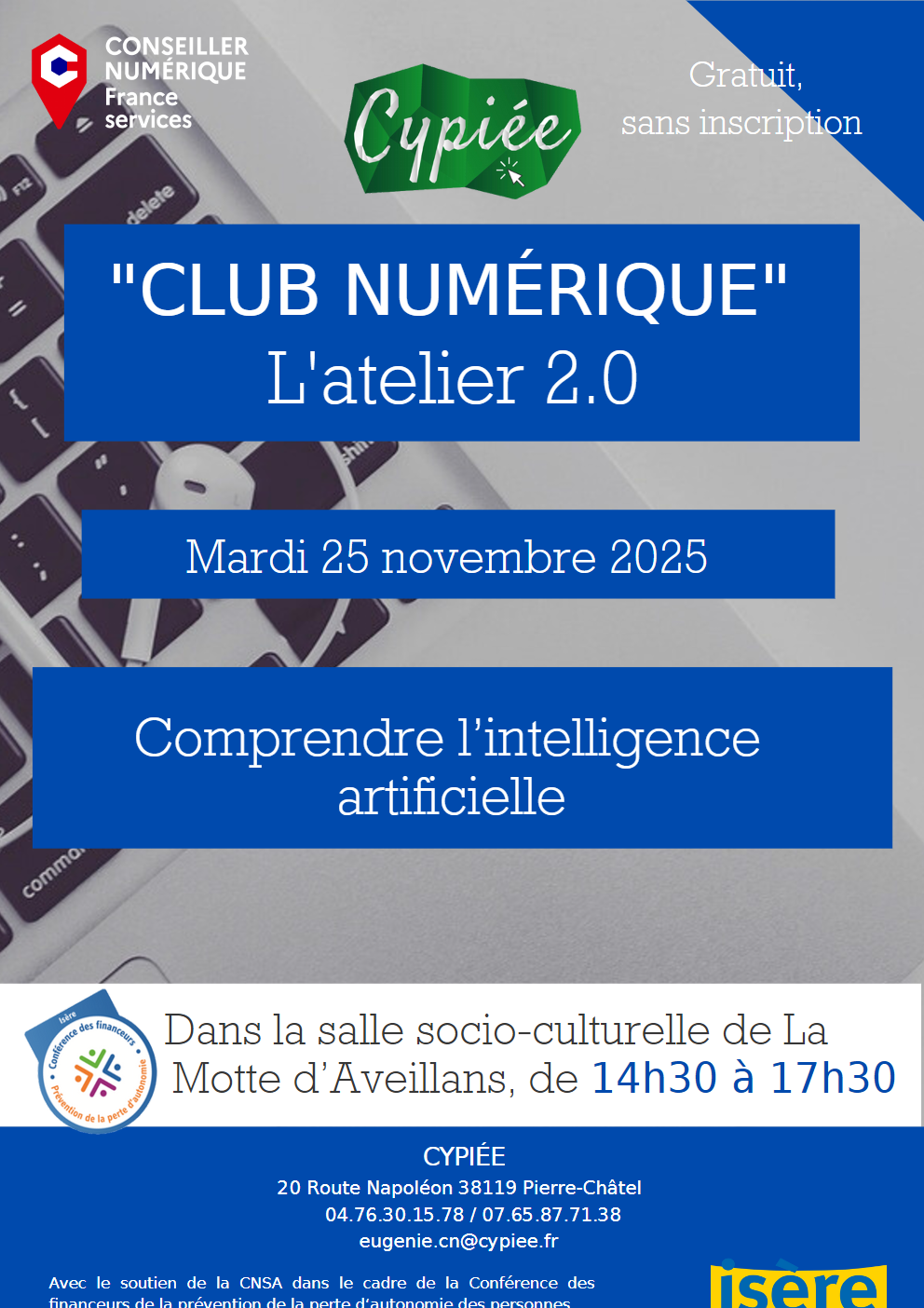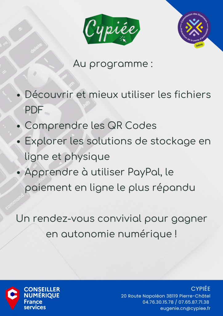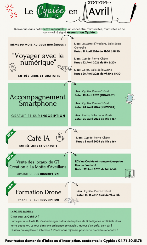 Qu’il s’agisse de votre téléphone portable, de votre tablette ou de votre ordinateur, nous sommes là pour vous assister, mais nous ne nous arrêtons pas là : nous proposons des ateliers découvertes autour de thématiques comme le drone, la parentalité numérique, la cyber-malveillance, l’IA, etc.